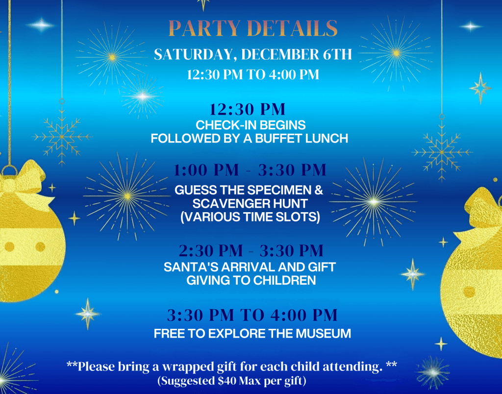 I am thrilled to host our 22nd Annual Children’s Christmas Party! This year’s event will be held on Saturday, December 6th, at 12:30 p.m. at the Canada Museum of Nature. We will have fun events like guess the specimen and a scavenger hunt, plus you can explore the museum. Santa will arrive at 2:30 p.m.!